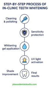 Professional teeth whitening is definitely safer than using at home hacks to whiten your teeth. Teeth whitening using either Hydrogen Peroxide or Carbamide Peroxide which penetrates your teeth and combines with the internal stains to oxidize them, thereby lightening your teeth. These agents are very safe to use on healthy enamel and do not cause any lasting damage. While using OTC whitening methods for Home whitening, it is better to use dentist-approved whitening systems to ensure safety. This is why a dental assessment before whitening is important, as it ensures the treatment enhances your smile without causing long-term sensitivity or enamel damage a philosophy that forms the foundation of preventive and aesthetic care followed at Plexus Dental Studio. Enamel health and thickness affect how well whitening works, which is why understanding essential vitamins for teeth is important before treatment.